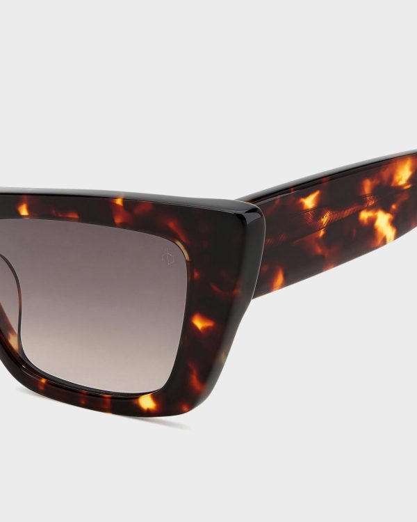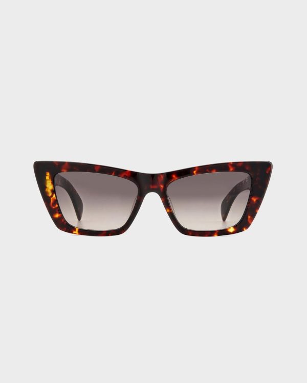A cat eye silhouette with an acetate frame and 100% UV protection.