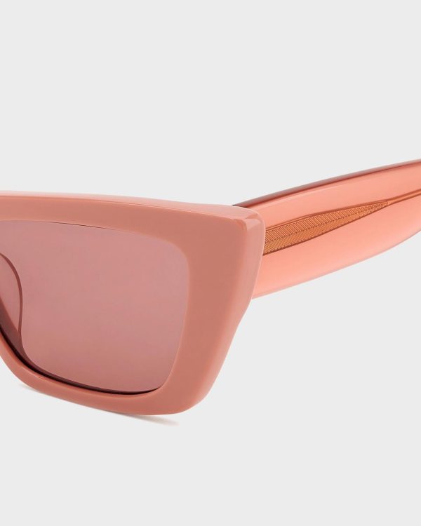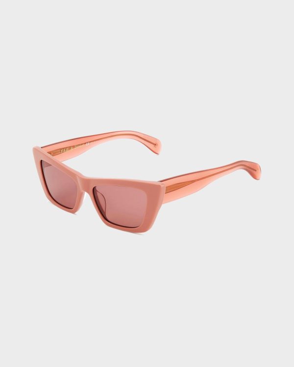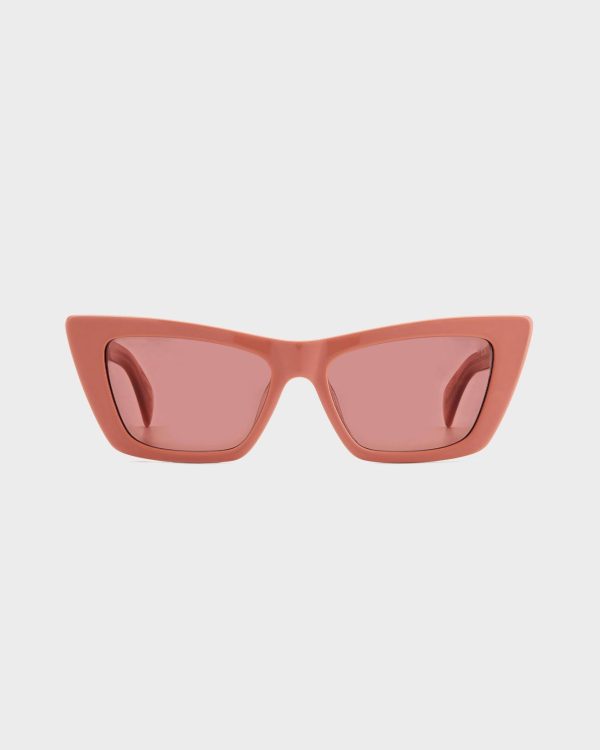 A cat eye silhouette with an acetate frame and 100% UV protection.