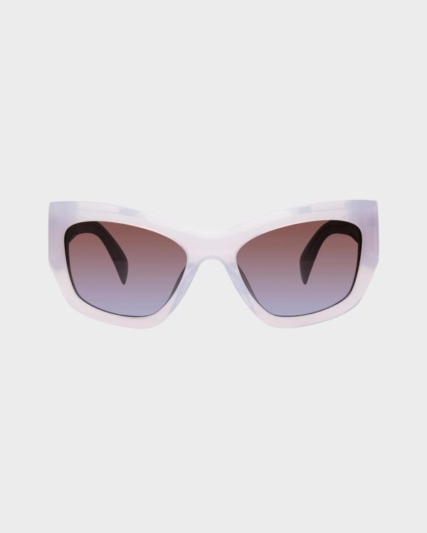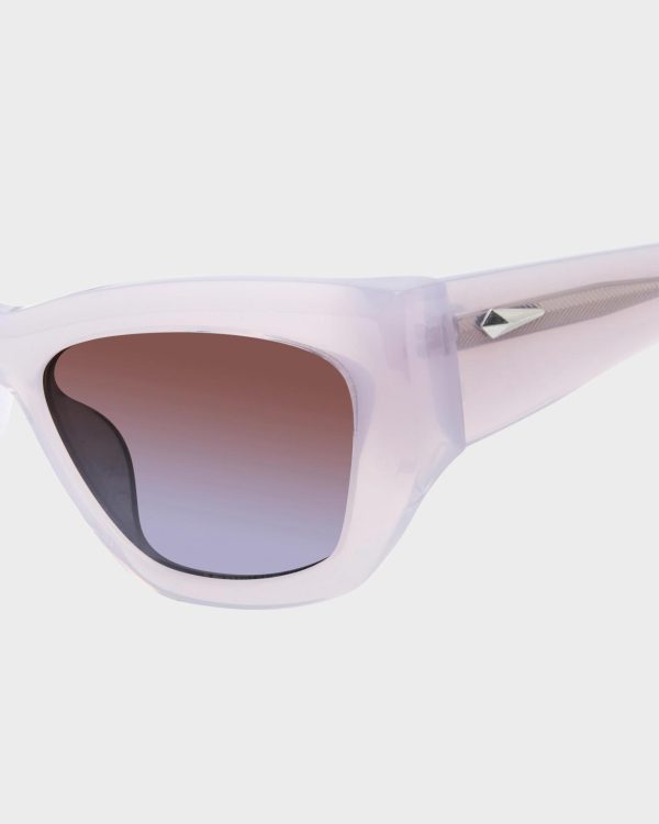 A cat eye silhouette with an eco acetate frame and 100% UV protection.