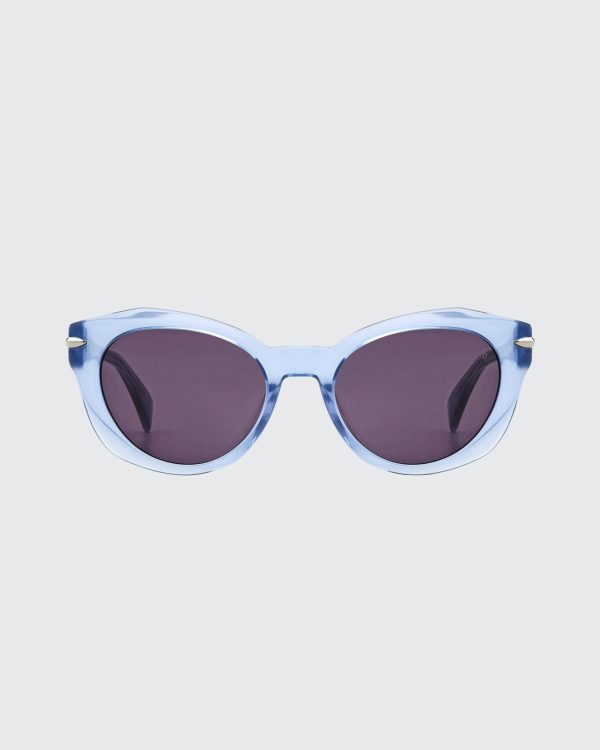 A cat eye silhouette with an acetate frame and 100% UV protection.