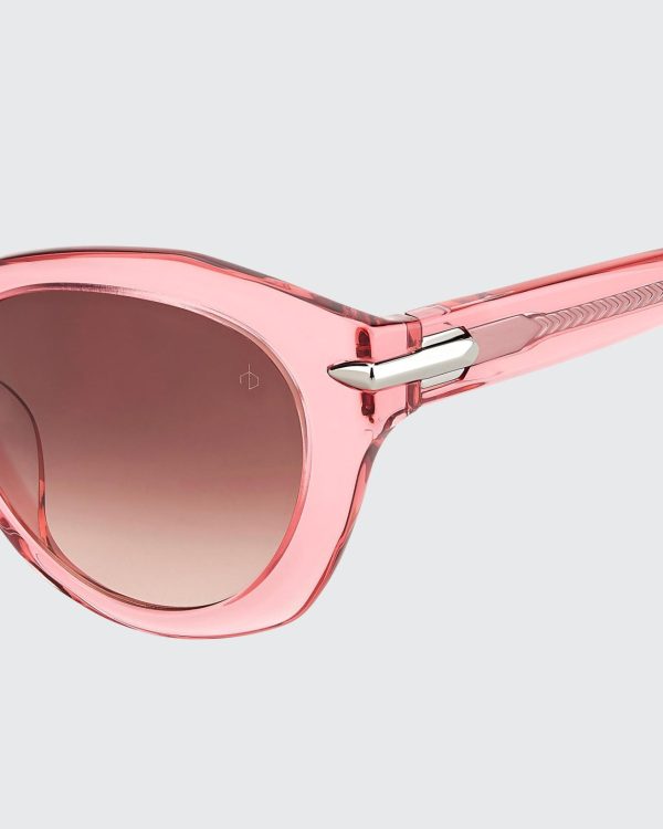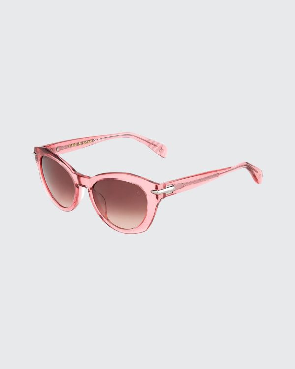 A cat eye silhouette with an acetate frame and 100% UV protection.