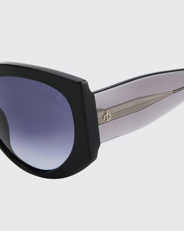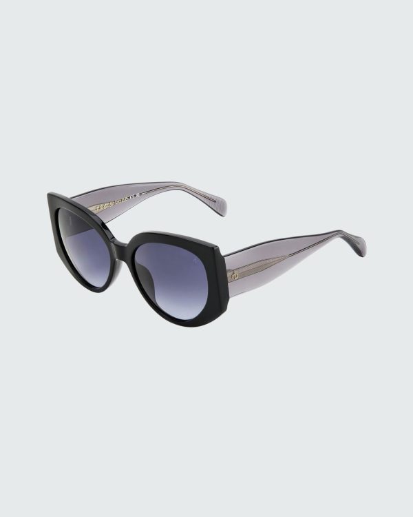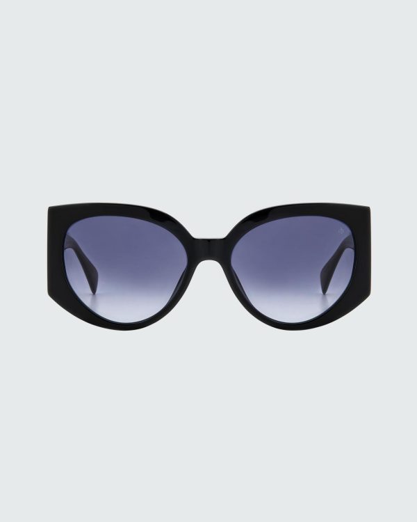 A cat eye silhouette with an eco acetate frame and 100% UV protection.
