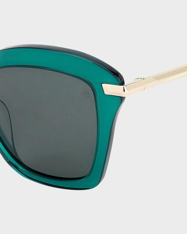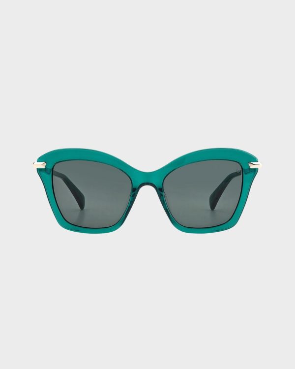 A cat eye silhouette with an acetate frame and 100% UV protection.