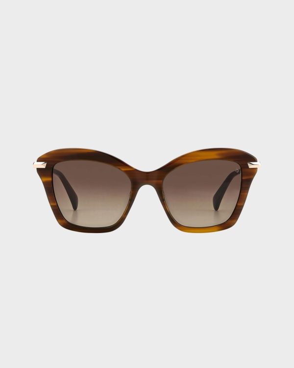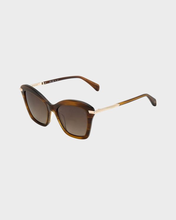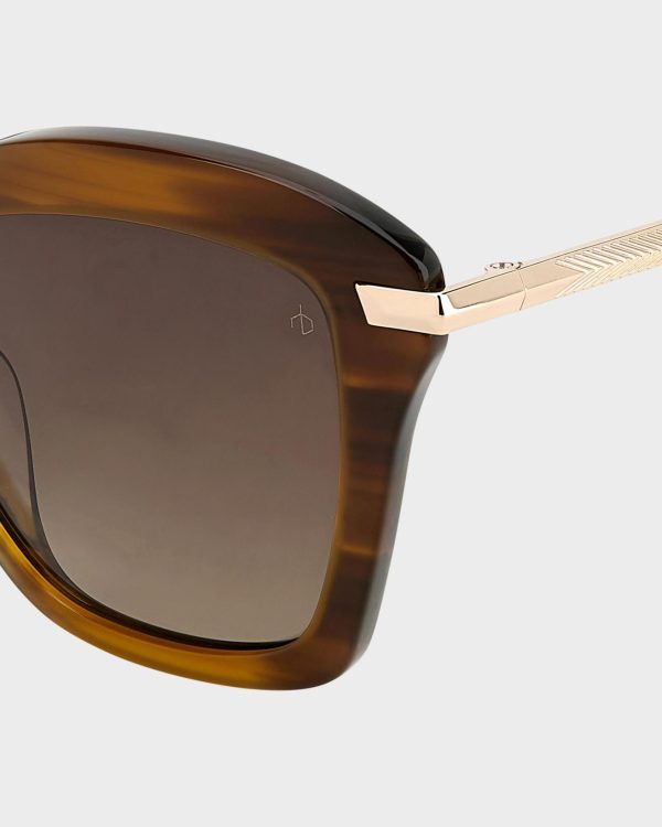A cat eye silhouette with an acetate frame and 100% UV protection.